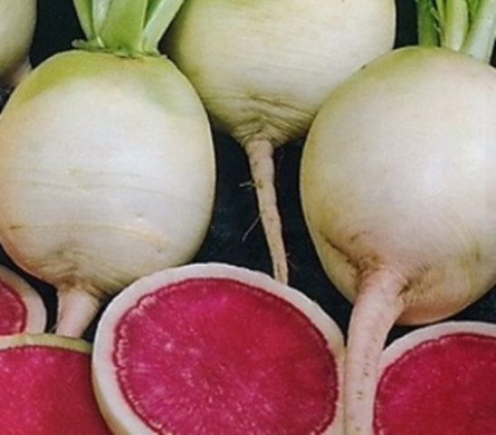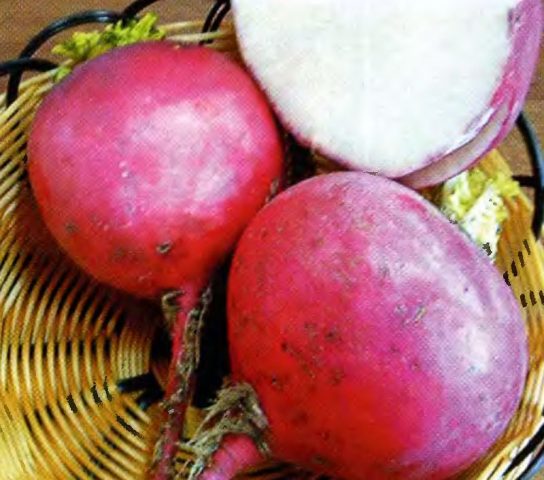 A variedade é madura precocemente, 60 dias após a germinação, pode-se colher. A raiz rosada ou quase vermelha, se você não levar em conta o tamanho, é semelhante a um rabanete. Mas pesa 500-890 G. As folhas de Severyanka estão meio crescidas, a raiz da colheita é arredondada, achatada, com uma ponta afiada. A polpa é suculenta, branca, de sabor agradável, com doçura e pungência pronunciadas. Produtividade de 1 sq. m - 3-4,8 kg.