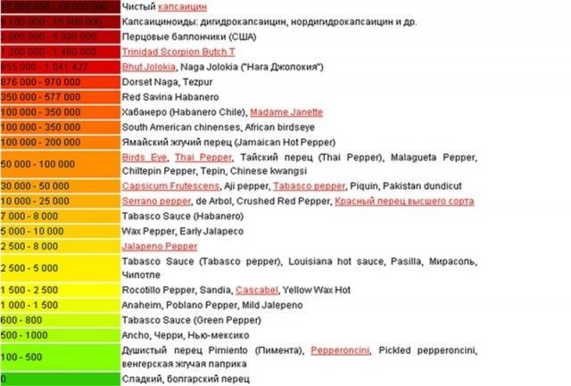 É impossível considerar pimentas vermelhas sem mencionar a escala de Scoville. Foi desenvolvido na América pelo químico Wilbur Scoville para comparar a severidade das variedades de pimenta. As unidades nele indicadas mostram o conteúdo de capsaicina em cada variedade. Conseqüentemente, quanto mais, mais unidades a variedade recebe e mais nítido seu sabor.