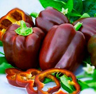 Pepper Chocolate Star of the East não é à toa que está no meio da temporada em termos de maturação. Como muitas variedades tardias, tem um alto rendimento - até 10 kg / m². metros e tamanhos de frutas bastante grandes - 270-350 gramas. A cor da fruta para os pimentões também é única, mas os amantes do chocolate ficarão desapontados - na fase de maturação completa, os pimentões tornam-se não exatamente chocolate, mas sim marrom avermelhado escuro. E no período de maturação técnica, a cor do fruto é verde escuro. Além do excelente sabor, este híbrido possui um peculiar aroma apimentado.