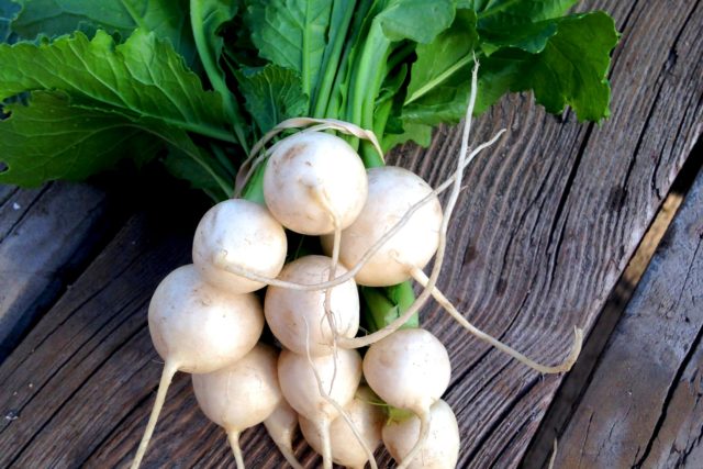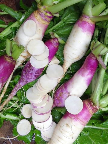 Variedade O roxo amadurece cedo em 60 dias. As raízes esféricas são rosa-carmesim na parte superior e brancas na parte inferior. A massa dos vegetais é de 80 a 100 g, sua polpa é branca, suculenta e compactada. Ele contém muitos minerais: potássio, magnésio, ferro, fósforo.