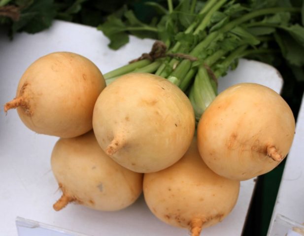 A forma das raízes é esférica. O peso médio é de 80 g, porém, há exemplares com peso de até 100 G. A polpa das raízes é macia, dura, branca, contém muito suco. Produtividade de 1 sq. m de desembarques é de 3,4 kg.