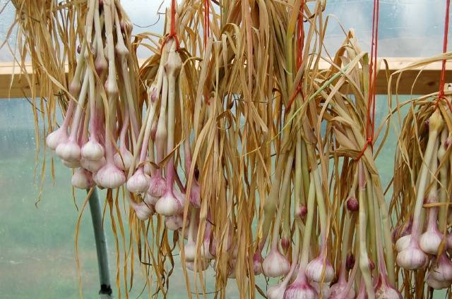 Para não danificar as raízes, antes de se retirar do solo, o alho deve ser cravado. Após a secagem, o alho pode ser tecido em feixes, com os quais muitos decoram suas casas. As cabeças grandes de alho duram mais, o que significa que é melhor deixá-las para depois. Em primeiro lugar, devem ser utilizadas cabeças pequenas para cozinhar, uma vez que não guardam bem.