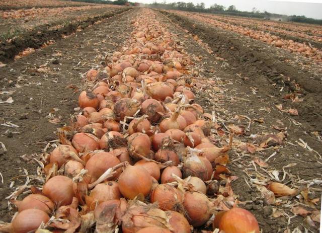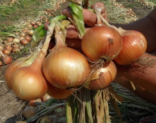 A cebola é colhida no momento em que o tronco principal da planta amolece. É muito importante que ele não tenha tempo para se secar. Nesse caso, o sabor da fruta se deteriora. A maneira mais conveniente de desenterrar a cebola é com um forcado. A colheita manual pode ser inconveniente, especialmente se o solo for seco e denso. Os garfos não danificam as frutas por si próprios e fazem um excelente trabalho na tarefa.
