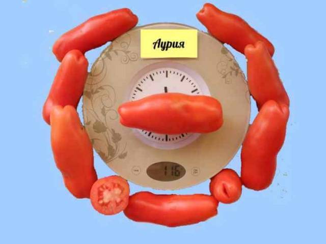 O mais interessante na descrição do tomate Auria são seus frutos. O vegetal de paredes irregulares, alongadas até 15 cm, deu origem a muitos nomes interessantes. O peso do fruto chega a 200 g, mas o peso médio de um tomate geralmente varia entre 80-150 g. Os tomates são amarrados com uma escova. Sua massa pode chegar a 0,8 kg. Esse peso é demais para brotos finos. Para que não se quebrem, os horticultores regulam o número de frutos retirando o excesso de ovário. O período de amadurecimento dos tomates vai de meados de julho a setembro.