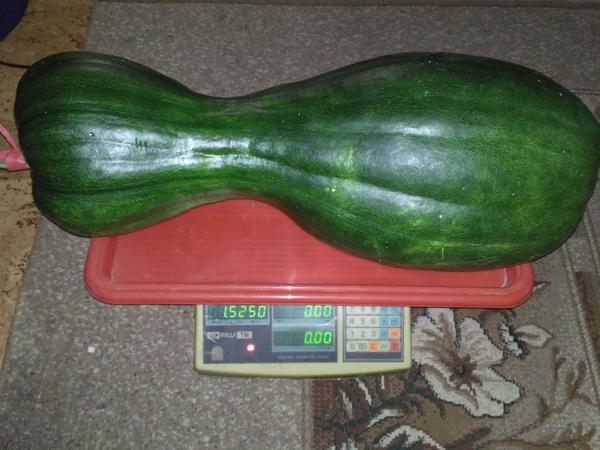 Uma novidade é uma variedade de meia estação, a cultura amadurece totalmente em 110-115 dias. O formato do fruto assemelha-se a um cilindro com um ligeiro espessamento no final. A abóbora madura pode pesar de 5 a 6 kg, às vezes há exemplares de 8 kg.