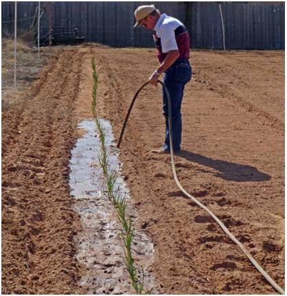 - Água é adicionada ao estrume na proporção de 1:10 e insistida por cerca de uma semana. Em seguida, despeja-se 1 parte da solução resultante com 5 partes de água e esse líquido já é regado nas plantações de cebola nos corredores. O caudal é igual ao da rega normal.