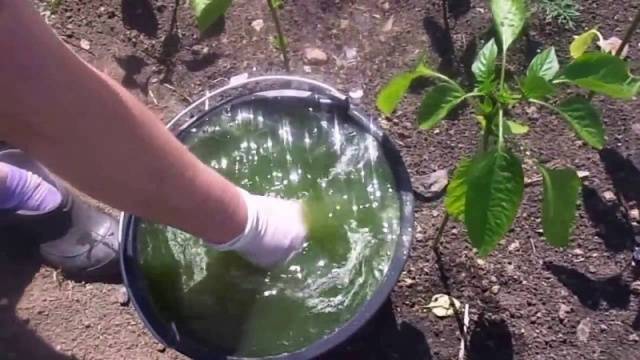 Se não for possível usar matéria orgânica, você pode dissolver fertilizantes especiais para pimentas e tomates com água de acordo com as instruções. Pegue um balde de água: