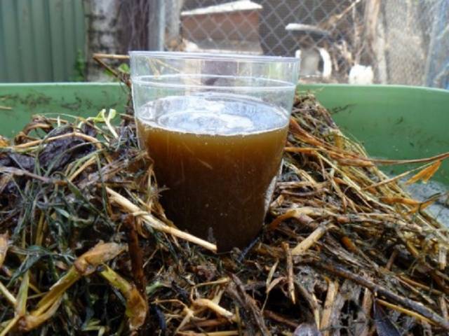 Para isso, prepare qualquer recipiente com capacidade para mais de 10 litros, encha-o bem com as ervas daninhas, acrescente alguns punhados de cinzas de madeira e encha tudo com água. Se houver uma oportunidade de adicionar pelo menos um excremento de passarinho ou estrume, então é ótimo, se não - está tudo bem, o líquido fermentará bem de qualquer maneira. Tudo isso deve se estabelecer por 12-15 dias e o fertilizante complexo acabado está pronto.