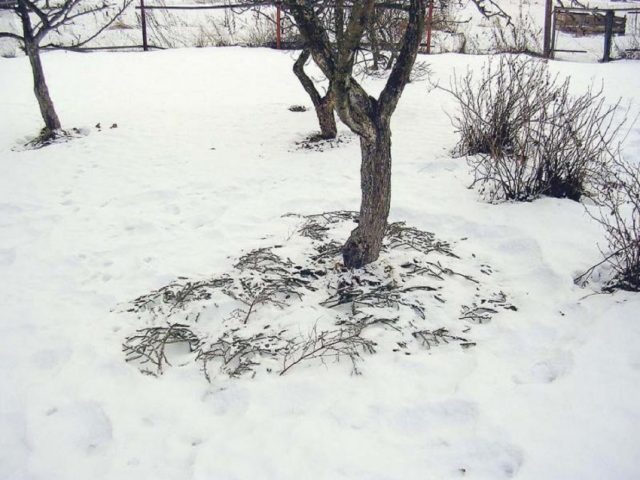 O terceiro método de retenção de neve é o abeto ou ramos de pinheiro, ramos de arbustos cortados no outono. Eles são amarrados em feixes, dispostos em volta dos troncos.