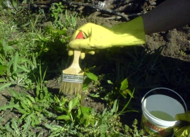 O local é tratado com uma solução herbicida uma vez. A droga é absorvida pelas folhas das ervas daninhas, de modo que não podem ser cortadas ou eliminadas antes do processamento. O processo de absorção dura até 6 horas.