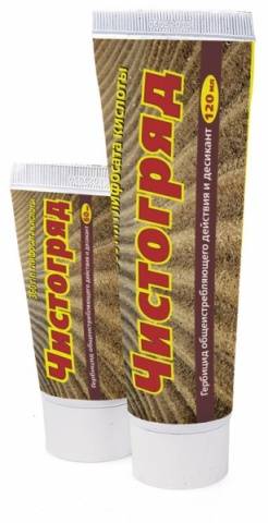O Herbicida Chistogryad está disponível em bisnagas de 50 e 100 ml ou em frascos com volume de 0,5 litros. O ingrediente ativo do Chistogryad é o sal de isopropilamina do glifosato. O mecanismo de ação desse herbicida sobre as ervas daninhas não é totalmente compreendido. Alguns estudos sugerem que o Chistogryad interrompe o processo do metabolismo celular nas plantas ao inibir o processo enzimático pelo qual os aminoácidos aromáticos são sintetizados - um elemento importante do metabolismo celular. Pegando ervas daninhas, Chistogryad é parcialmente absorvido por elas e, movendo-se através dos vasos, penetra nas raízes. O efeito do herbicida será perceptível após 10 dias, e a morte completa das ervas daninhas ocorrerá após 3 semanas. O Chistogryad não pode ser absorvido pelas raízes das plantas.