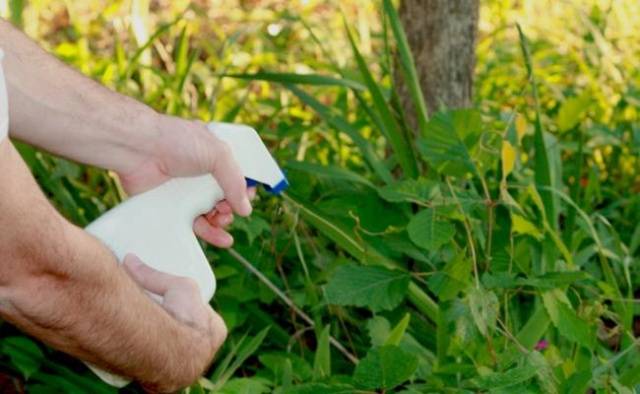 Muitas pessoas acham conveniente borrifar as plantas com um borrifador comum. Um pulverizador de bomba também é adequado. Desta forma, você pode cultivar áreas próximas à estrada, em calçadas e em outros locais onde você não precisa se preocupar com outras plantas.