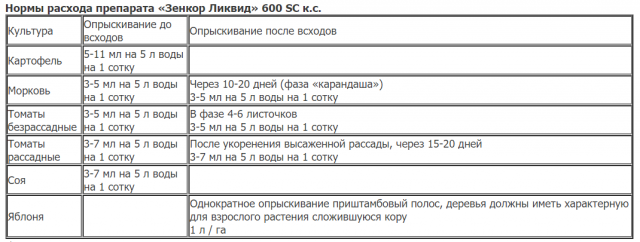 O herbicida deve ser diluído dependendo de qual planta precisa ser destruída.Portanto, para cereais por 1 ha, há 0,2–0,3 litros, para tomates - 0,7 litros por 1 ha, para batatas - 0,75 litros por 1 ha. Para cenouras - 0,2–0,3 litros por hectare.