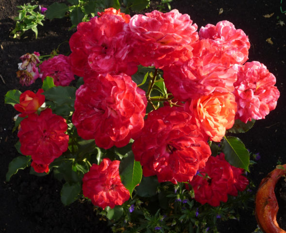 - Os botões são coletados em inflorescências paniculadas simples de 4-9 unidades, simples, mas raras. Floribunda Solstício de verão rosa, tipo duplo, laranja-avermelhado. A parte central da flor pode ser vinho claro com um tom amarelo, as pétalas externas são mais escuras, a parte inferior é laranja.