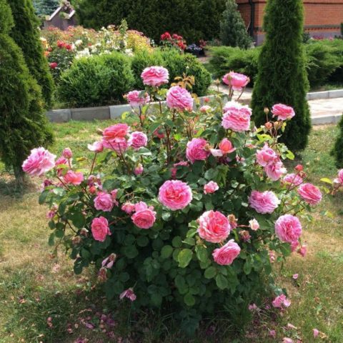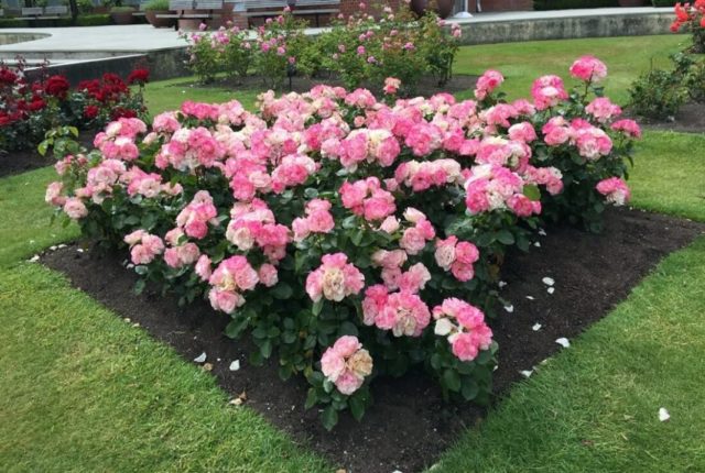 Rose Princess Alexandra de Kent é usada para plantações em grupo de 3-4 arbustos em um canteiro de flores. Essas composições são fáceis de executar e bastante populares.