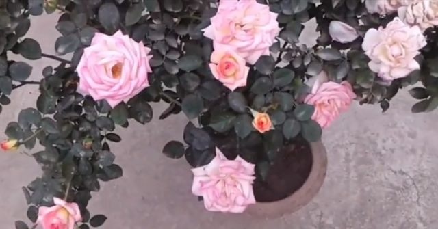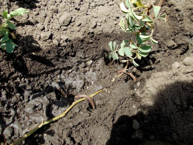 - A rosa é colocada no centro e coberta com o resto do substrato fértil. Os caules são encurtados, deixando 15–20 cm.