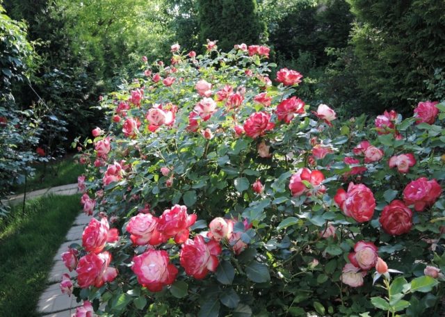 - Uma rosa é plantada perto do caminho do jardim para calçar árvores altas decorativas.