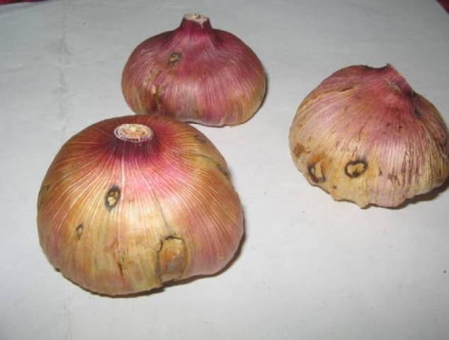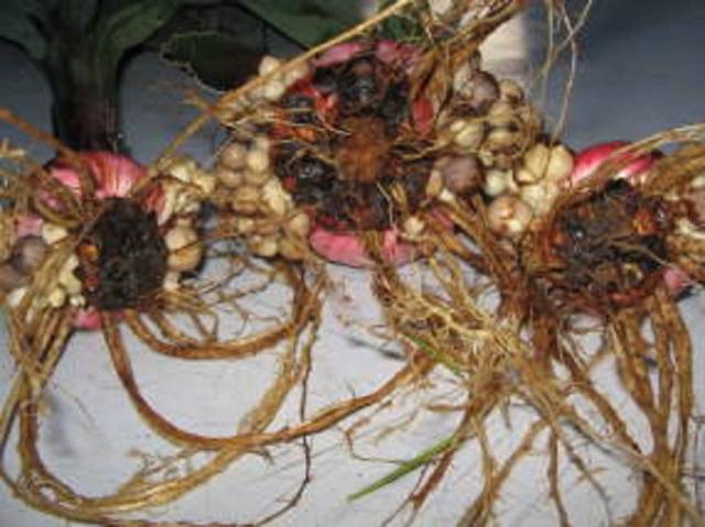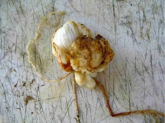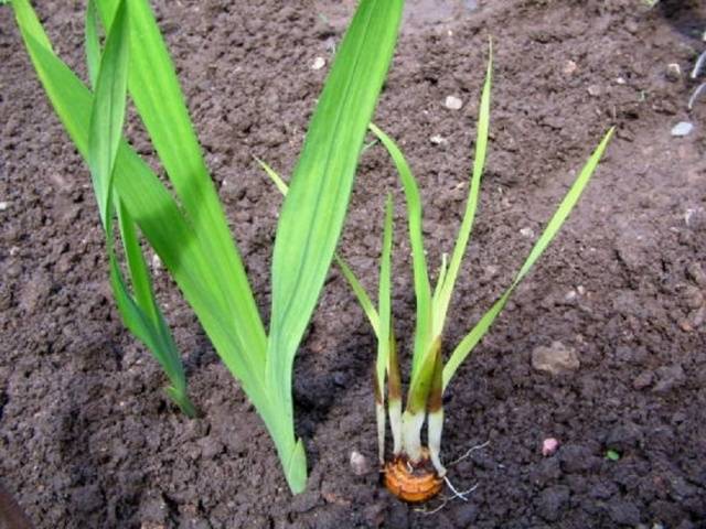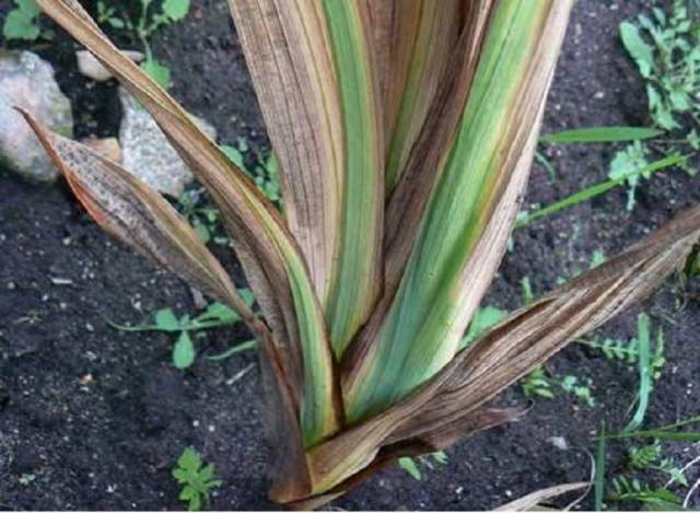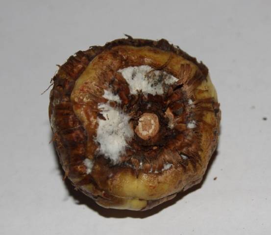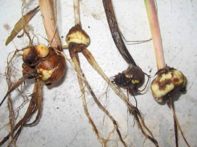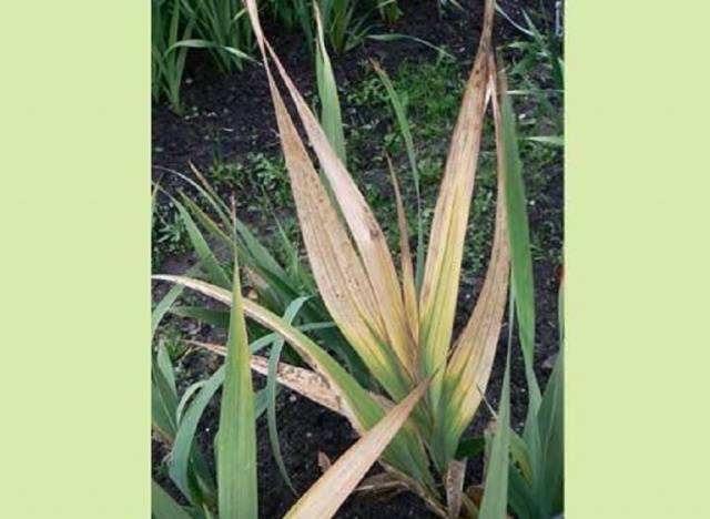 Como a infecção fúngica anterior, tem as mesmas razões para seu rápido desenvolvimento. Mas em solos ácidos e úmidos, o clima frio e úmido estimula a propagação da doença. Um sinal de dano será o aparecimento de pequenas manchas escuras nas folhas. As folhas enfraquecem na base, ficam amarelas e depois secam. No rizoma, não há sinais pronunciados da doença, mas durante o armazenamento a doença se manifesta. Aparecem manchas de tonalidade amarelada que, com o aumento, mudam de cor para castanho-avermelhado e depois preto. O próprio cormo fica duro e apodrece.