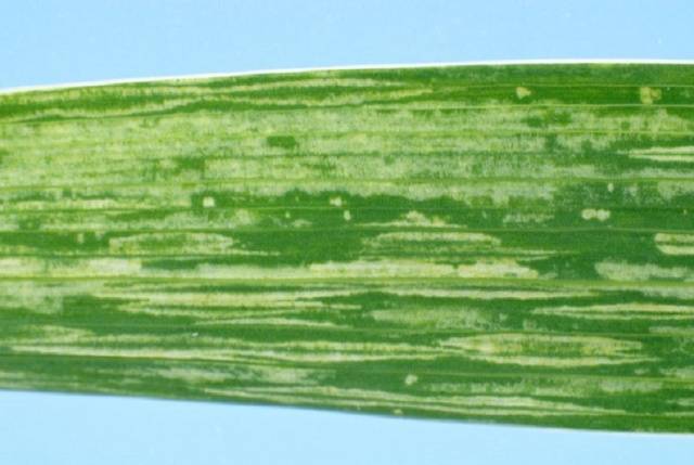 As copas das folhas ficam amarelas e na parte inferior da planta formam-se manchas de tom castanho-avermelhado. Posteriormente, eles são transformados em listras ao longo das folhas. As folhas apodrecem, o caule quebra na base. No rizoma também se formam manchas. Primeiro amarelo, depois marrom. Durante o período de armazenamento, a propagação da doença não é observada. Antes do plantio, a crosta é limpa e o local do corte é tratado com verde brilhante. Os produtos de controle de sarna são ineficazes. A melhor técnica seria amostrar material saudável e seguir cuidadosamente os requisitos da tecnologia agrícola.