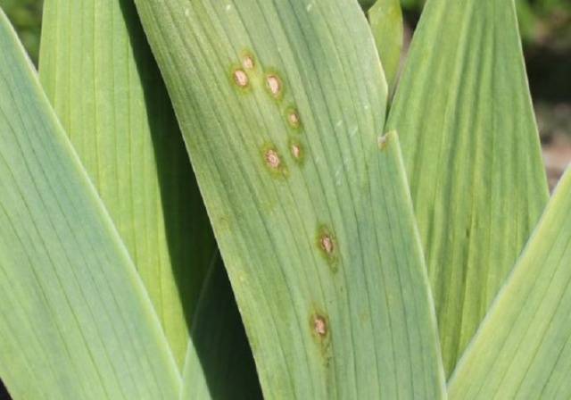 As folhas são cobertas por pequenas manchas marrons com uma borda vermelha. Eles crescem, mudando a cor das folhas, que morrem. Com tempo úmido, uma flor fofa é visível nas folhas. O caule se quebra, então se fixa, e a podridão penetra abaixo. O cormo morre. Os esporos do fungo são transportados pela água e pelo vento. As medidas de controle não diferem de outras doenças fúngicas, mas você pode adicionar o tratamento com uma solução de bicarbonato de sódio de rebentos antes do plantio (50 g de pó por balde de água).