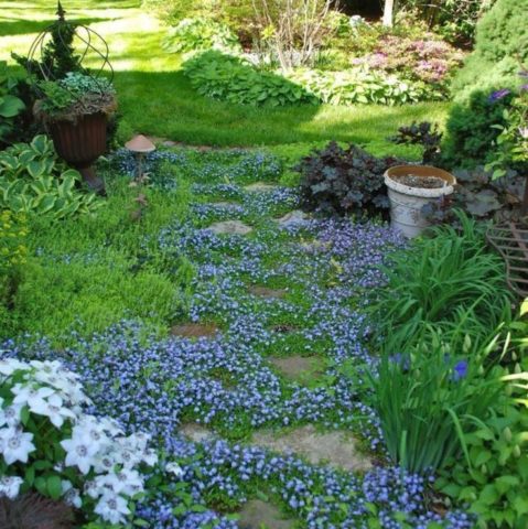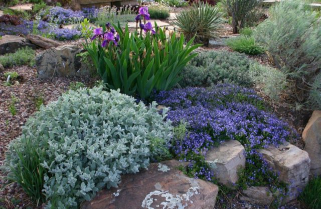 - A cor azul das flores está em harmonia com a pedra natural. A planta é usada para decorar jardins de pedras.