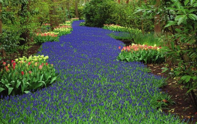 - A genciana primaveril é usada para compactar o plantio linear de tulipas.