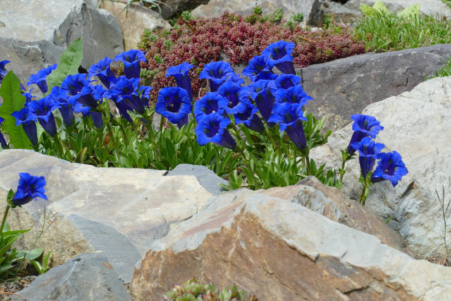 O período de decoratividade na genciana é curto - apenas durante a floração, essa característica é levada em consideração nas estruturas de design. Exemplos do uso de genciana em jardinagem ornamental ajudarão na escolha da composição ideal:
