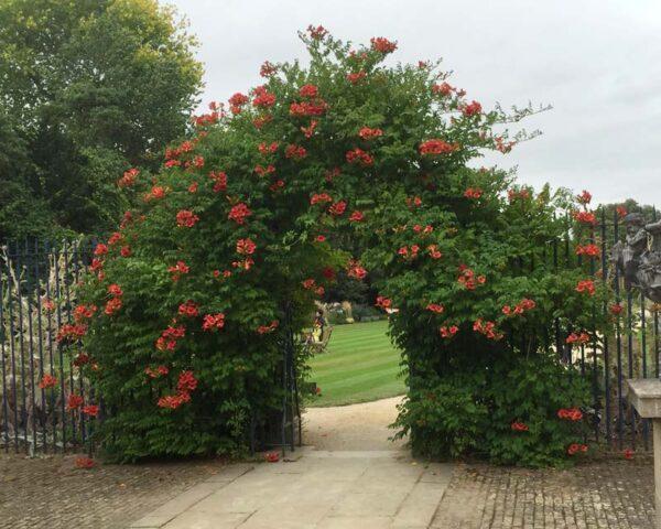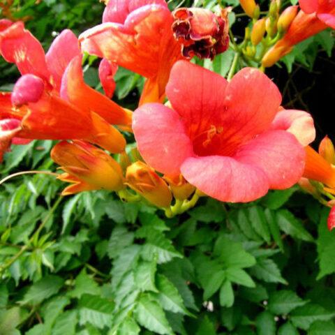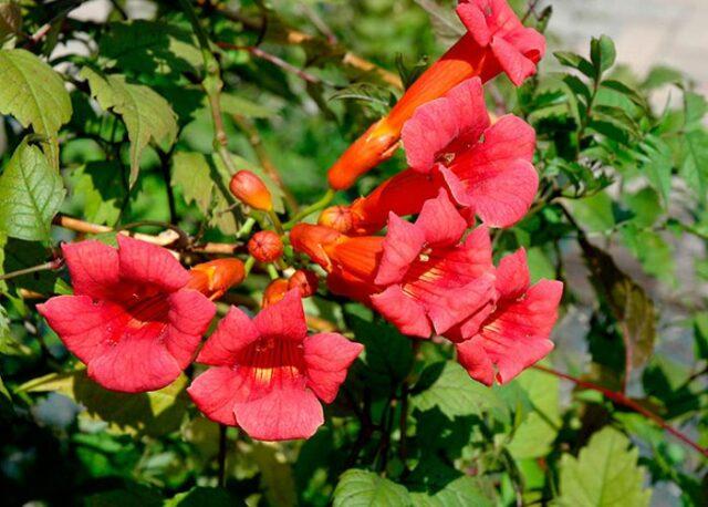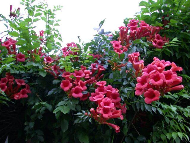 Rooting campsis é uma das melhores trepadeiras para a jardinagem vertical. Tem uma taxa de crescimento muito rápida e grande altura. As flores são de cor brilhante: do amarelo rico ao púrpura escuro e carmesim. Quando cultivada na faixa do meio, a planta precisa de abrigo adicional para o inverno.