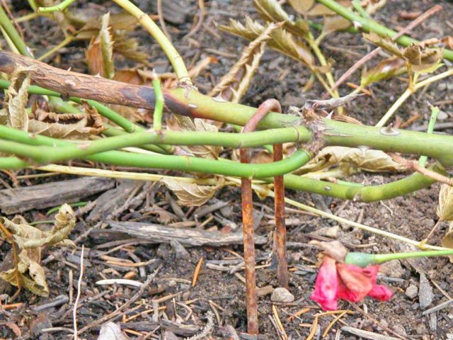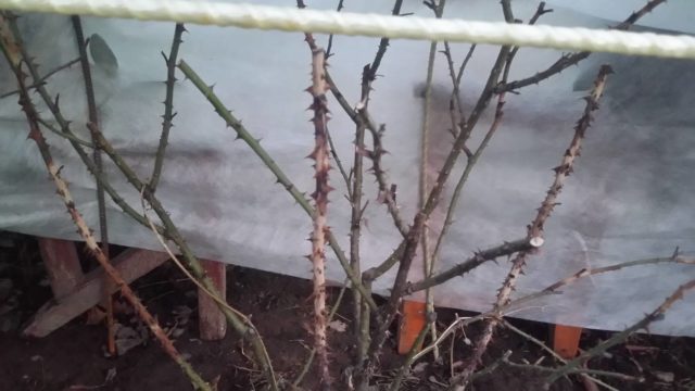Os longos caules de uma rosa trepadeira são removidos do suporte no outono, colocados horizontalmente, cobertos com areia ou solo e, em seguida, cobertos com palha, folhas caídas ou ramos de abeto. Esta construção é completada com agrofibra, papelão ou material para telhados, fixados em moldura especial.