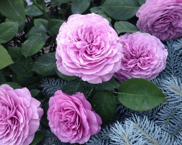 Roseira espinhosa Lavender Ice se sente bem quando plantada entre coníferas