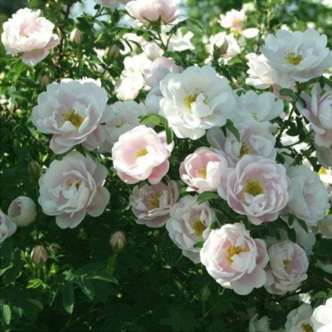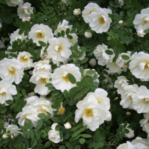 Uma variedade resistente ao gelo que não precisa de abrigo durante o inverno. É caracterizada por se espalhar por arbustos de até 1,5 m de altura, com brotações fortes. Portanto, ele não precisa de suporte. A variedade plena Pimpinellifolia floresce uma vez por temporada. Os botões são semi-duplos, de cor branca cremosa e com forte aroma.