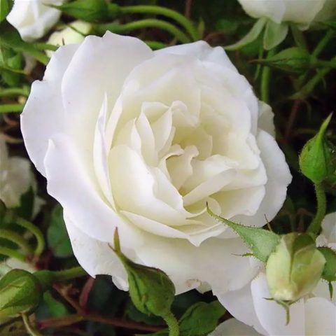 Variedade de floração repetida com várias ondas longas. Forma arbustos de tamanho médio com até 1,5 m de altura e cerca de 0,7 m de diâmetro. Os rebentos são eretos, fortes, de cor verde claro. As flores da rosa Schneewittchen são de tamanho médio, 7-8 cm de diâmetro, coletadas em pincéis de 5-20 pcs. As pétalas são brancas. Os botões são perfumados, a vida útil de cada 3-5 dias.