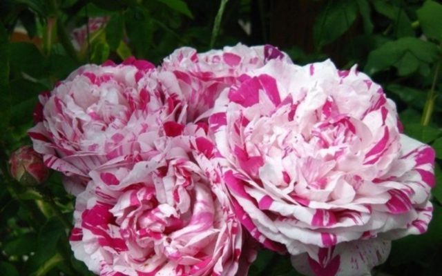 A peculiaridade dessa variedade é que suas flores são listradas. Eles aparecem no mato no início de junho e persistem até setembro. Os botões são coletados em pequenas inflorescências de 3-5 pcs. Quando florescem, adquirem a forma de taça, e o diâmetro chega a 6-10 cm.Cada flor é composta por 25 pétalas. A rosa Ferdinand Richard tem botões de um tom vermelho-carmim, e listras rosa são claramente visíveis nela. No processo de floração, o tom principal torna-se ainda mais brilhante, e o claro torna-se quase branco. A espécie tem um aroma adocicado e delicado.
