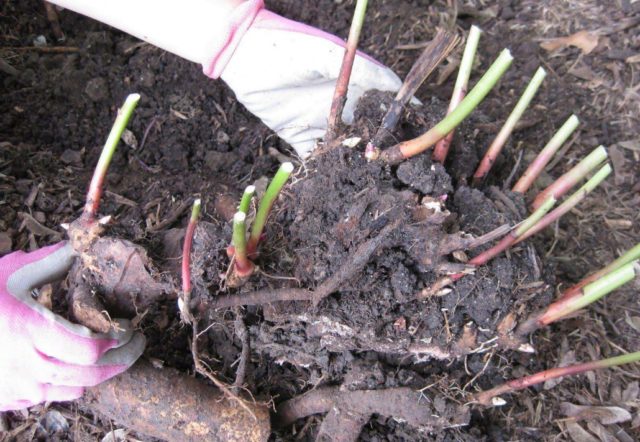 Delenki são obtidos cortando partes de uma peônia com botões de crescimento