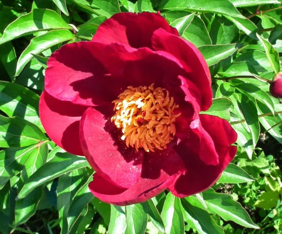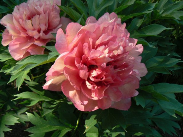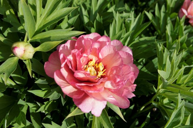 Os híbridos ITO são arbustos grandes e poderosos com brotos fortes. Eles têm raízes espalhadas localizadas perto da superfície da terra. Com o tempo, eles crescem muito e ficam rígidos. Isso torna o transplante difícil. A altura da mata chega a 8,5 dm. Os brotos podem dobrar com o peso das flores, mas não ficam no chão. As folhas são densamente organizadas. Eles são semelhantes aos das variedades de árvores - também esculpidas. A massa verde em híbridos AID pode persistir até o início da geada. No outono, sua tonalidade muda apenas em certas variedades. Assim como nas peônias herbáceas, nos híbridos ITO, os brotos morrem anualmente. Isso acontece no outono. Na primavera, eles crescem do solo novamente.
