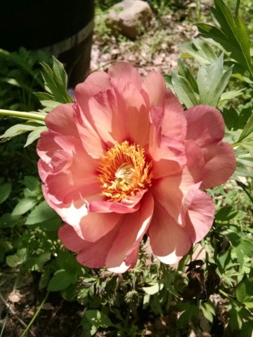 Chaleira de cobre significa "chaleira de cobre". Esta é outra variedade rara e não muito comum de peônias ITO. É apreciada pelos floricultores devido à sua despretensão. As flores tricolores semi-duplas desta variedade são verdadeiras gigantes. O diâmetro é de 20 cm. Os tons de escarlate, amarelo e laranja combinados conferem à flor um aspecto "cobre" único. O arbusto deste híbrido ITO cresce lentamente. Sua altura máxima é de 90 cm.