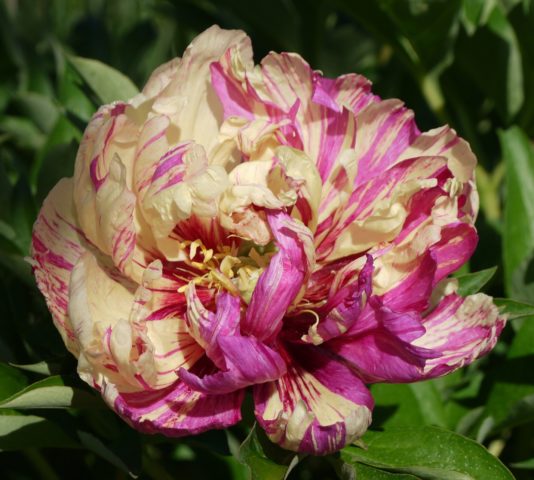 Lois Choice é uma peônia ITO criada nos EUA em 1993. Flores de Terry, cor complexa. Os botões abrem cedo. A base das pétalas é bege e branca. Este tom no topo se transforma em amarelo bege e rosa pêssego. Os rebentos da variedade são fortes, as placas foliares são de um verde rico.