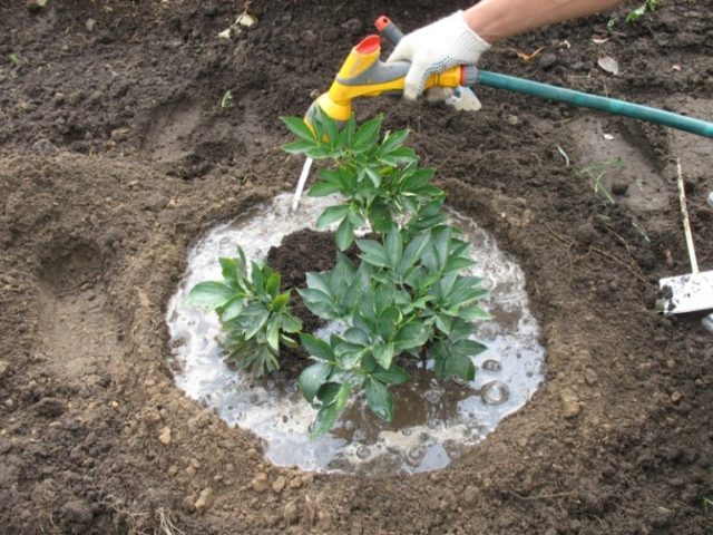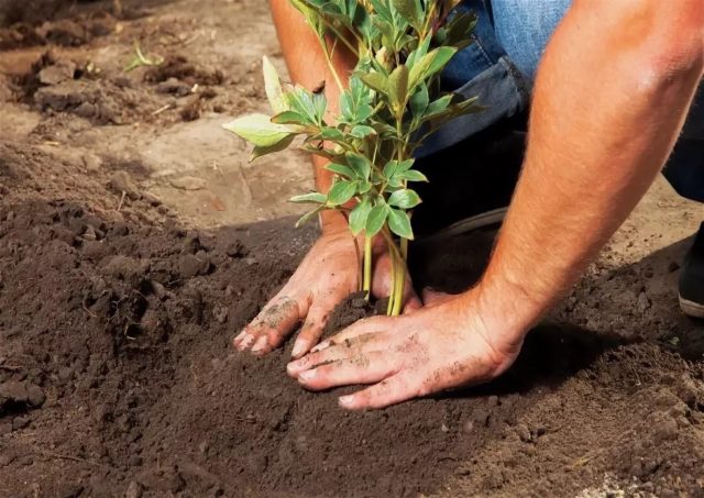 Se você planeja plantar vários arbustos de peônia no local, os buracos são colocados em incrementos de pelo menos 1 m. Eles são preparados em 30 dias para que o solo tenha tempo de se assentar.
