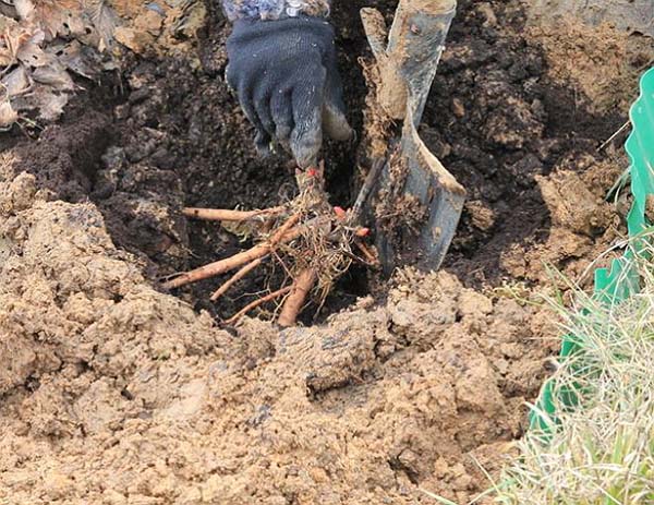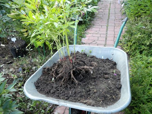Durante o transplante, as peônias são retiradas, tentando não danificar gravemente seu sistema radicular.