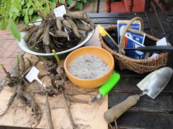 O tamanho das raízes de reserva é idealmente próximo ao tamanho de uma cenoura média. Rebentos muito grandes são cortados, tratando o corte com cinzas.