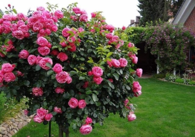 O caule é cultivado de maneira especial, a rosa parece uma pequena árvore de flores brilhantes