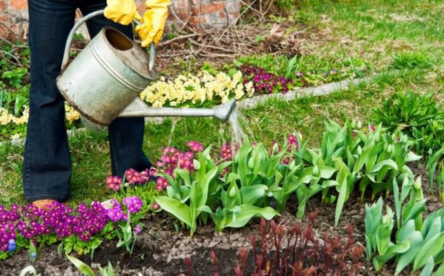 As tulipas papagaio precisam de rega regular. Se chove raramente, o solo é umedecido à razão de 20 litros por 1 m².
