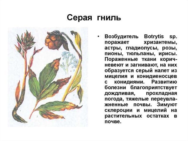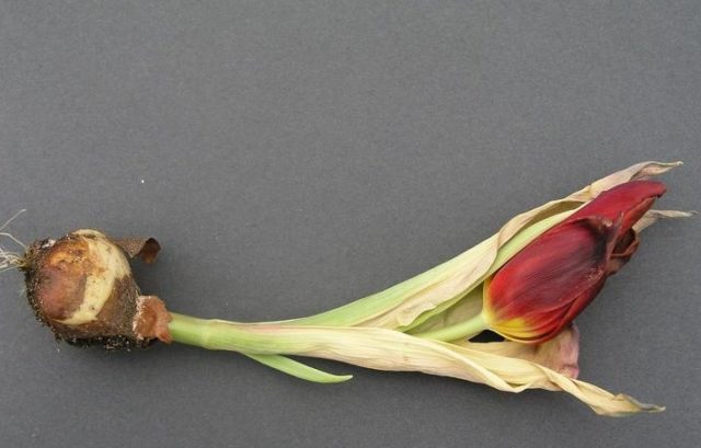 - Podridão botrythia. Seu aparecimento é provocado pelo fungo Botrytis cinerea. Os bulbos escurecem, adquirindo coloração marrom e maciez, neles podem ser detectados pontos pretos constituídos por micélio de cogumelo. As tulipas germinam mal ou nem aparecem. Os brotos que aparecem são lentos, enfraquecidos, quebram-se rapidamente e morrem. O aparecimento da doença é facilitado pela alta umidade ou desembarque tardio.
