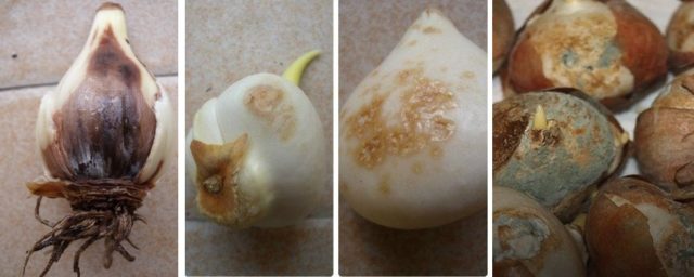 - Podridão branca. Os agentes causadores são vírus. A doença é mais freqüentemente registrada em regiões com solo ácido. A irrigação excessiva ou alta umidade causada pela precipitação pode provocar o aparecimento do vírus. A doença pode ser detectada na primavera, quando parte do material de plantio não germina ou dá pequenos brotos que rapidamente ficam amarelados e morrem. Depois de desenterrar as plantas danificadas, você pode ver manchas cinza-azuladas nos bulbos, enquanto as raízes parecerão completamente saudáveis. A podridão branca pode afetar o pescoço e o ponto de crescimento. Nesse caso, pode-se notar uma flor esbranquiçada, que logo começa a ficar marrom. A planta morre e os esporos do fungo continuam a viver no solo por 5 anos.