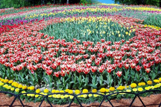 Uma plantação circular parece incomum, onde várias tulipas se alternam