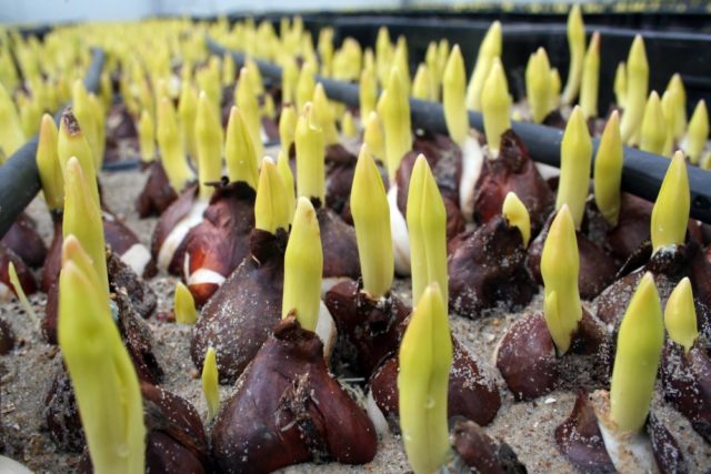 As tulipas são transferidas para luz e calor para destilação no início de fevereiro.