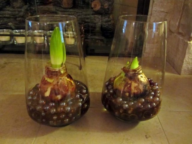 - No início de fevereiro, o material de plantio precisará ser removido e transplantado para um hidrogel. Para isso, os grânulos são abundantemente embebidos em água fria e aguardam até incharem, para depois serem colocados num vaso de vidro ou numa tigela grande.