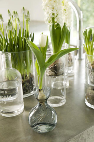 - Água fria é colocada em um vaso alto com uma base larga e gargalo estreito, após o qual as tulipas são colocadas nele. Os bulbos devem ser apoiados pelo pescoço e as raízes puxadas para baixo, mas sem tocar o nível da água.