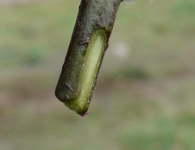 Para o caldo, é necessário escolher um broto em que a casca seja facilmente separada da madeira. Um corte com um corte longitudinal oblíquo é colocado sob ele. Deve ficar 3-4 cm abaixo da casca.