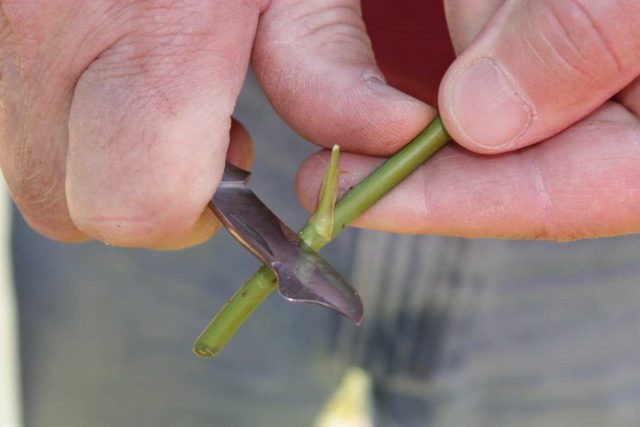 Outra opção para a cópula é enxertar em um recorte em forma de cunha. É feito em um broto de roseira brava se a espessura do rebento exceder significativamente o diâmetro da estaca. Ele é encaixado para caber dentro do recorte.